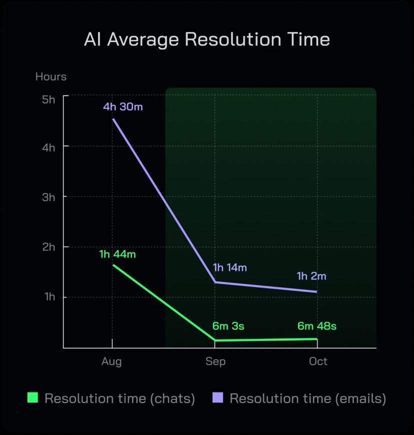 After integrating our AI Agent with the client's Freshdesk and Freshchat workspace, ProjectFitter's support operations were significantly automated. Within two months of service, we’ve achieved stunning results: about 70% of all support requests are resolved by AI now, while the average resolution time dropped from hours to minutes. The standout aspect of the client’s journey was the rapid deployment — completed in just two weeks — enabling them to quickly unlock the value of AI with minimal friction.